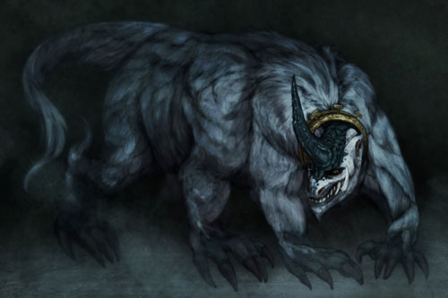 鋭く尖った角を伸ばす頭部には、獰猛さを示す肉を引き裂く牙が生え揃い唸りを漏らす。