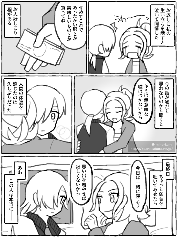 ハルは胸倉を掴む手を離して柔らかく微笑み、ジプソはおんおんと男泣きし始めた。頼もしい鋼の男が見る影もない。