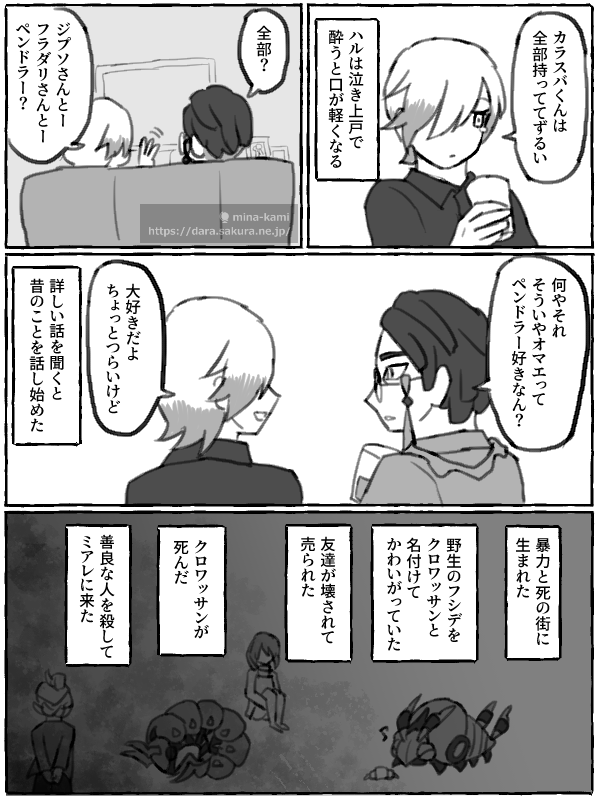 ハルは胸倉を掴む手を離して柔らかく微笑み、ジプソはおんおんと男泣きし始めた。頼もしい鋼の男が見る影もない。