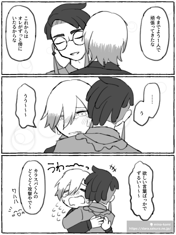 胸倉を掴む手は少し震えている。まっすぐな眼差しがカラスバを射抜く。